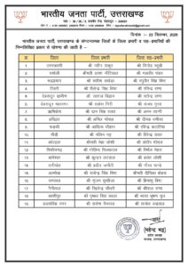 भारतीय जनता पार्टी ने अपने संगठनात्मक जिलों के जिला प्रभारी और सह प्रभारियों की घोषणा कर दी है। भाजपा के प्रदेश अध्यक्ष महेंद्र भट्ट की ओर से इसकी सूची जारी की गई है।