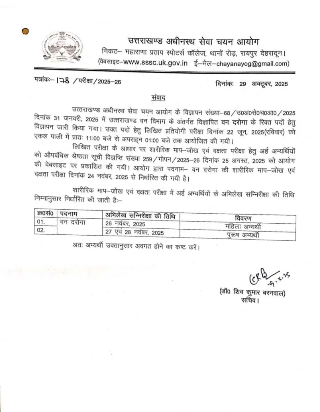 अब आयोग ने अगला चरण घोषित करते हुए सूचित किया है कि वन दरोगा पद के लिए शारीरिक माप-जोख एवं दक्षता परीक्षा 24 नवम्बर, 2025 से प्रारंभ की जाएगी।